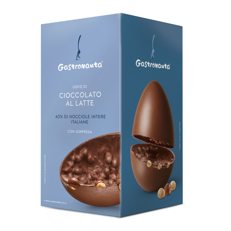 Una cascata sorprendente di nocciole intere – ben il 40% – croccanti, tostate al punto giusto, generose nella quantità e intense nel sapore. Non un semplice ripieno, ma un’esplosione di gusto che rompe la dolcezza del cioccolato con la forza fragrante della frutta secca.